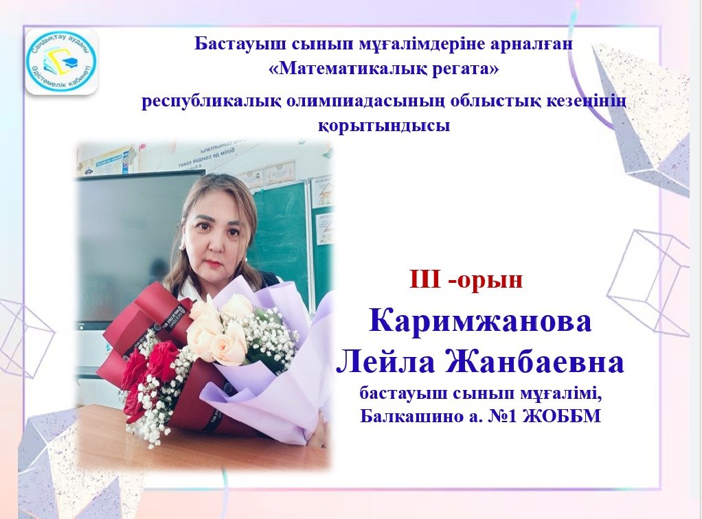 2026 жылғы 3 сәуірде Көкшетау қаласында №20 мектеп-гимназия базасында бастауыш сынып мұғалімдеріне арналған «Математикалық регата» республикалық олимпиадасының облыстық кезеңі өтті. Олимпиада қорытындысы бойынша Балкашин ауылының №1 жалпы орта білім беретін мектебінің бастауыш сынып мұғалімі Каримжанова Лейла Жанбаевна 3-орынды иеленді. Педагогты жоғары нәтижесімен құттықтаймыз! Алдағы уақытта да жеңістер мен кәсіби жетістіктер тілейміз!