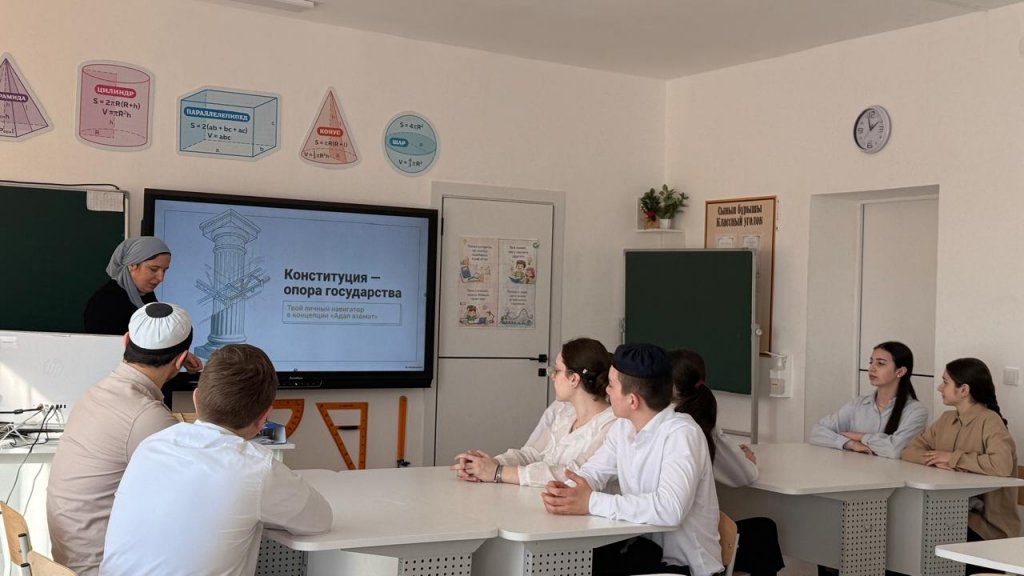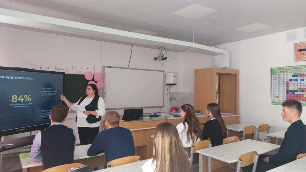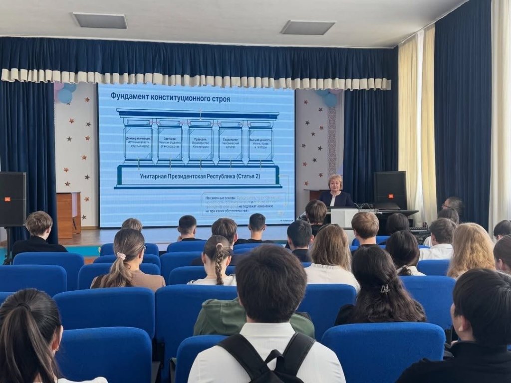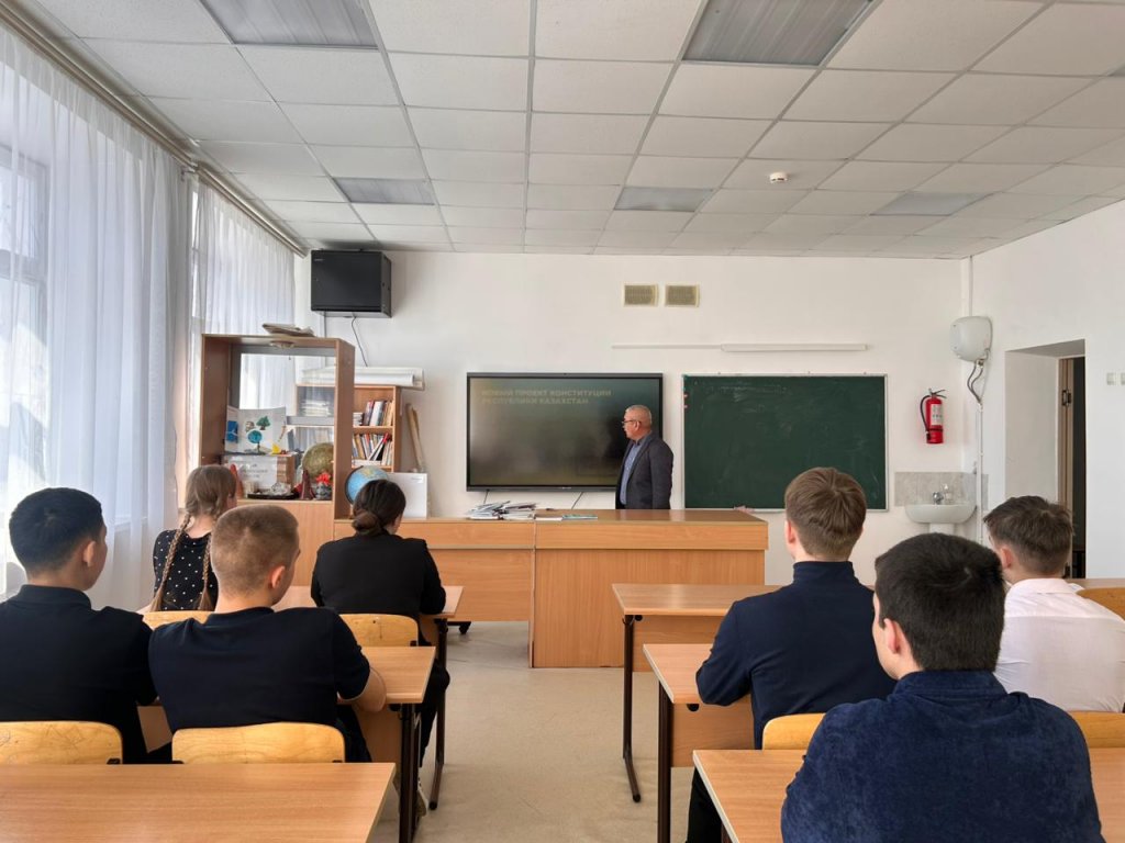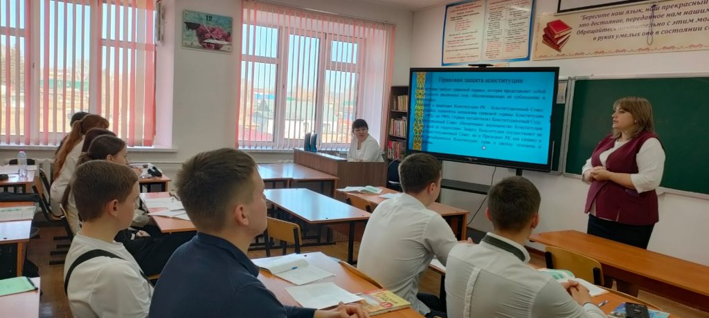 Негізгі мақсаты: Қазақстан Республикасының жаңа Конституциясының мазмұнын түсіндіру, оқушылардың құқықтық сауаттылығын арттыру және азаматтық жауапкершілігін қалыптастыру. Сынып сағаты барысында оқушыларға жаңа Конституцияның негізгі баптары түсіндірілді. Оқушыларға Конституцияның маңызды бөліктерінің бірі – преамбула екені жеткізілді. Преамбула – Конституцияның мазмұнын, оның негізгі идеясын және мемлекет басшылыққа алатын басты құндылықтарды айқындайтын бөлім. Жаңа Конституцияда алғаш рет преамбула мен жалпы ережелер деңгейінде «Әділетті Қазақстан» құндылықтық бағыты мемлекеттік дамудың негізгі бағдаршамы ретінде бекітілгені атап өтілді. Бұл қағидат «Заң мен тәртіп» принципімен және адам құқықтары мен бостандықтарын мойындаумен бірге мемлекеттің дамуының іргелі негізін қалыптастырады. Оқушылар жаңа Конституцияда бірлік, ынтымақ, ұлтаралық және конфессияаралық келісім сияқты құндылықтардың мемлекетіміздің маңызды негіздері ретінде айқындалғанына назар аударды. Егемендік, тәуелсіздік және аумақтық тұтастық қағидаттары өзгермейтін құндылықтар ретінде бекітілгені атап өтілді.Сонымен қатар, жаңа өзгерістердің маңызды бағыттарының бірі – білім беру, ғылым, мәдениет және инновацияларды дамыту болып табылады. Бұл Қазақстанның болашағы тек табиғи ресурстармен ғана емес, ең алдымен білімді, шығармашыл және белсенді азаматтармен байланысты екенін көрсетеді.
