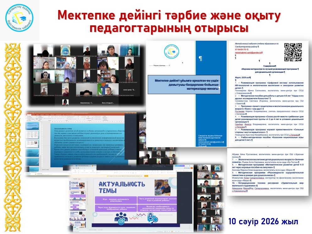 "Заң және тәртіп баланың көзімен" идеологиясын ілгерілету жөніндегі іс-шаралар жоспарына сәйкес 2026 жылғы 10 сәуірде тәрбиешілер өздерінің педагогикалық идеяларын, әзірлемелері мен буклеттерін көрсеткен отырыс өтті. Отырыс қорытындысы бойынша тәрбиешілердің үздік бағдарламалары әзірленіп оған аудан тәрбиешілерінің үздік бағдарламалары кірді.
